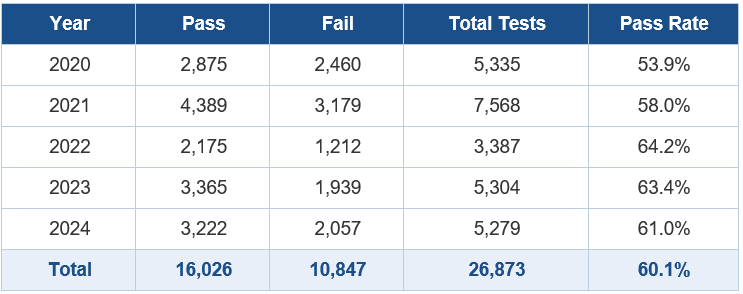 Testing volumes remained relatively stable throughout the 2020–2024 period, suggesting that MELT did not significantly reduce the number of individuals pursuing a Class 1 licence. Across 26,873 Class 1 road tests conducted between January 2020 and December 31, 2024, a total of 16,026 resulted in a pass and 10,847 in a fail, producing an overall pass rate of approximately 60 percent.